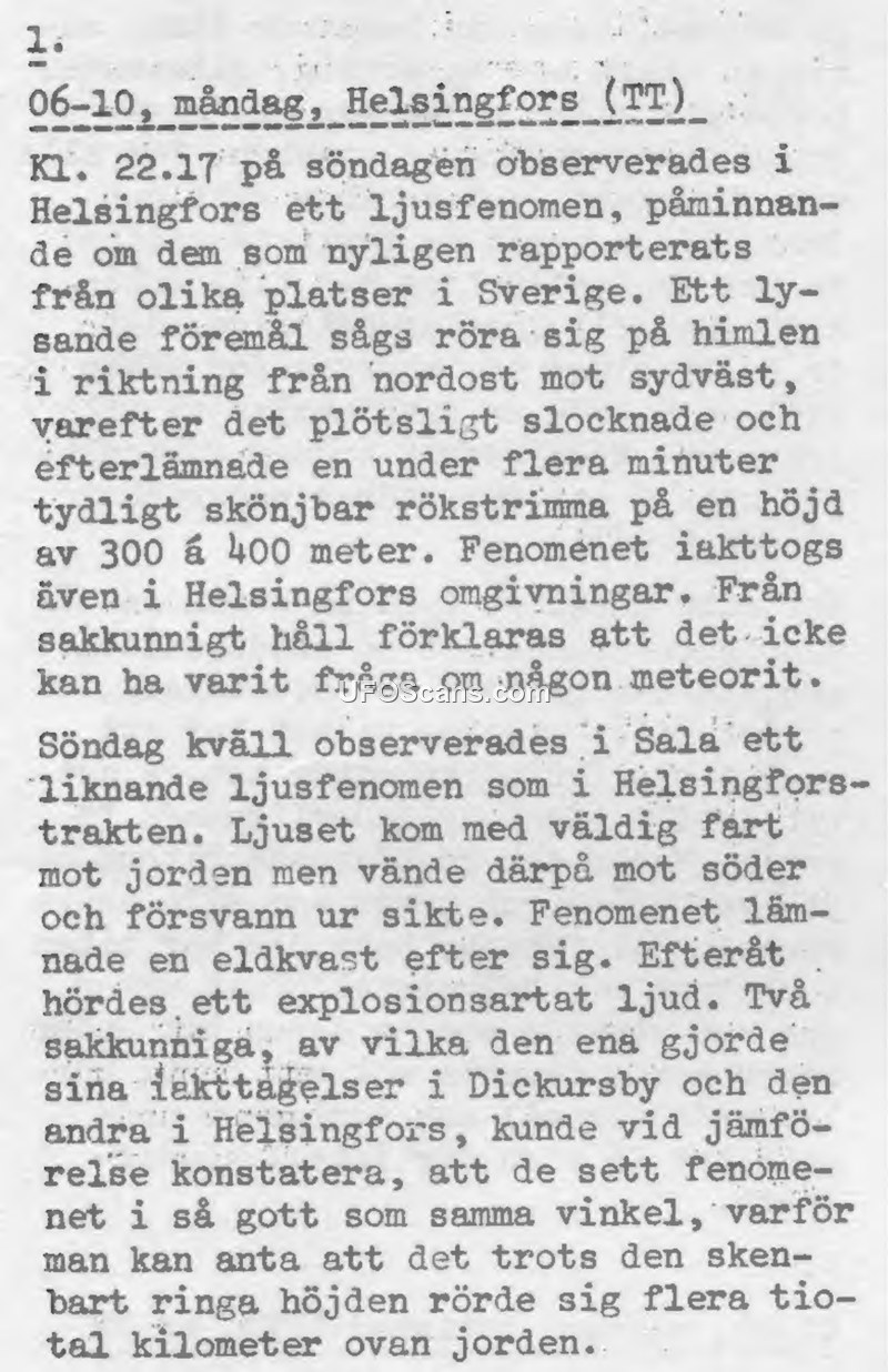 This press report from the news agency TT details luminous phenomena observed on a Sunday evening in Helsinki and Sala. In Helsinki, at 22:17, a luminous object was seen moving from the northeast to the southwest. It suddenly extinguished, leaving behind a smoke trail visible for several minutes at an altitude of 300 to 400 meters. Experts explicitly ruled out the possibility of a meteorite. A similar phenomenon was reported in Sala, where an object moved rapidly toward the earth before turning south and disappearing, leaving a trail of fire and producing an explosion-like sound. Two experts, observing from Dickursby and Helsinki respectively, compared their findings and determined that they had viewed the phenomenon from nearly the same angle. They concluded that, despite the appearance of a low altitude, the object was likely traveling several tens of kilometers above the ground.
