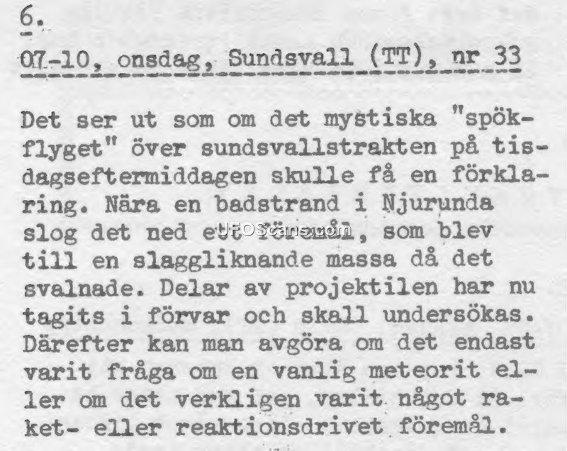 This press report from the Swedish news agency TT (Tidningarnas Telegrambyrå) details an incident involving a mysterious 'ghost flight' over the Sundsvall area. On a Tuesday afternoon, an unidentified object reportedly struck the ground near a beach in Njurunda. Upon cooling, the object transformed into a slag-like mass. Authorities have taken parts of the projectile into custody for examination. The purpose of this investigation is to determine whether the object was a common meteorite or a rocket- or reaction-driven device.