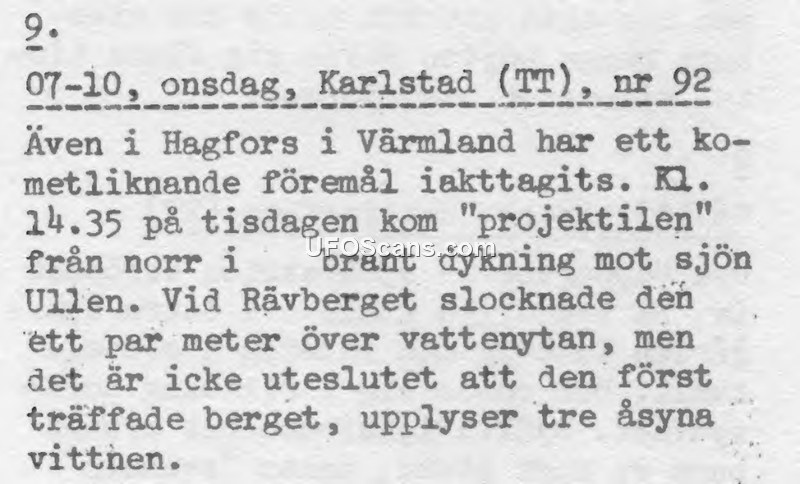 A press report detailing a sighting of a comet-like object in Hagfors, Sweden, on a Tuesday at 14:35. Three witnesses observed the object diving toward Lake Ullen before it extinguished near the water.