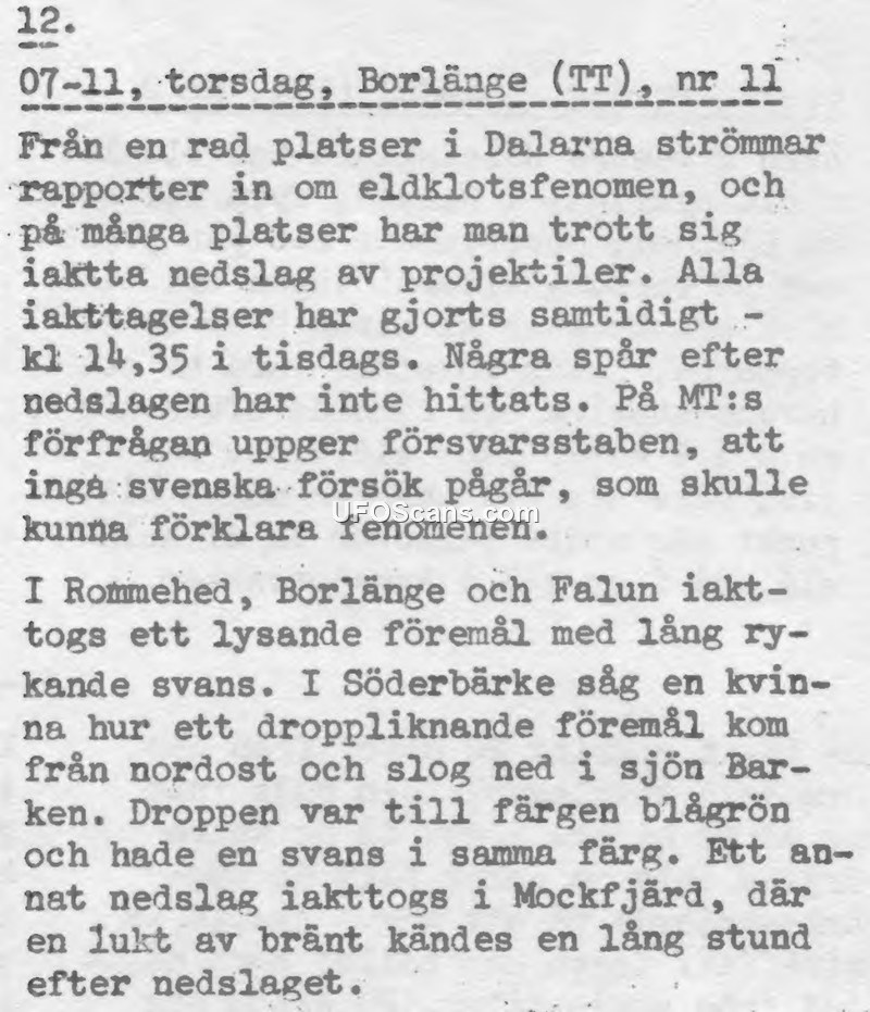 This press report from TT (Tidningarnas Telegrambyrå) details a series of sightings of fireball phenomena across the Dalarna region of Sweden. Numerous reports were filed regarding these events, which occurred simultaneously at 14:35 on a Tuesday. Witnesses in Rommehed, Borlänge, and Falun reported seeing a luminous object with a long, smoking tail. In Söderbärke, a woman observed a droplet-shaped object traveling from the northeast before it struck Lake Barken; she described the object and its tail as blue-green in color. Another impact was reported in Mockfjärd, where a smell of burning persisted for a long time after the event. Despite the widespread nature of the sightings, authorities found no physical traces of the objects. When queried by MT, the Swedish Defence Staff (Försvarsstaben) confirmed that no ongoing Swedish experiments could account for these phenomena.