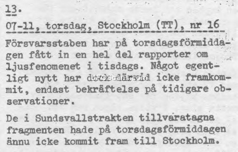 This document, identified as report number 13, provides a brief update from the Swedish Defense Staff (Försvarsstaben) regarding a light phenomenon observed on the preceding Tuesday. According to the report, the Defense Staff had received a significant number of accounts concerning the event by Thursday morning. However, the authorities noted that these reports provided no new information, serving only to confirm earlier observations. Furthermore, the document mentions that physical fragments recovered in the Sundsvall area had not yet reached Stockholm as of Thursday morning.