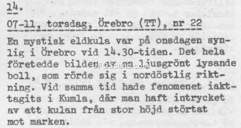 This document is a brief press report, identified as number 22, detailing a sighting of a mysterious fireball. The event occurred on a Wednesday at approximately 14:30. The object was observed in Örebro, where it was described as a glowing, light-green ball moving in a northeasterly direction. Simultaneously, the phenomenon was observed in Kumla, where witnesses reported the impression that the object had fallen from a great height toward the ground.