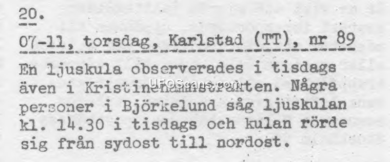 A report of a light sphere observed by multiple witnesses in Björkelund, Sweden, at 14:30 on a Tuesday. The object was observed moving from the southeast to the northeast.