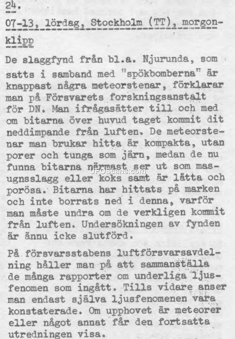 This press clipping, dated July 13th, reports on the ongoing investigation by the Swedish National Defence Research Institute (Försvarets forskningsanstalt) into physical evidence linked to the 'ghost bombs' (spökbomberna). The institute has analyzed slag found in Njurunda and concluded that these items are unlikely to be meteorites. Unlike meteorites, which are described as compact, heavy, and non-porous, the recovered pieces are light and porous, bearing a strong resemblance to blast furnace slag or coke. The researchers expressed skepticism regarding the theory that these objects fell from the sky, noting that they were discovered resting on the surface rather than being embedded in the ground. The investigation into these specific findings remains incomplete. Concurrently, the Air Defense Department of the Defense Staff is in the process of aggregating numerous reports concerning strange light phenomena. At the time of the report, the authorities had only confirmed the occurrence of the light phenomena themselves, while the nature and origin of these events—whether they are meteoric or of another source—remain subject to further investigation.