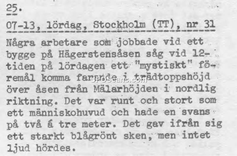 A press report from Stockholm describes a silent, blue-green, round object with a tail seen by construction workers at treetop height. The sighting occurred on a Saturday at noon, moving north from Mälarhöjden.