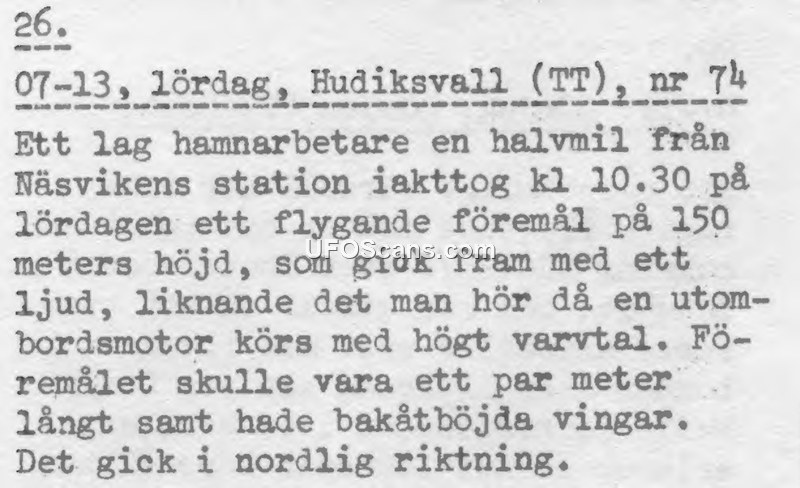 This document, labeled as entry 26, reports a sighting of an unidentified flying object near Hudiksvall, Sweden. On a Saturday at 10:30, a group of harbor workers located a half-mile from the Näsviken station observed a flying object at an altitude of 150 meters. The witnesses described the object as being a couple of meters long with swept-back wings. The object was noted for producing a sound similar to an outboard motor running at high revolutions per minute. The object was observed traveling in a northerly direction.