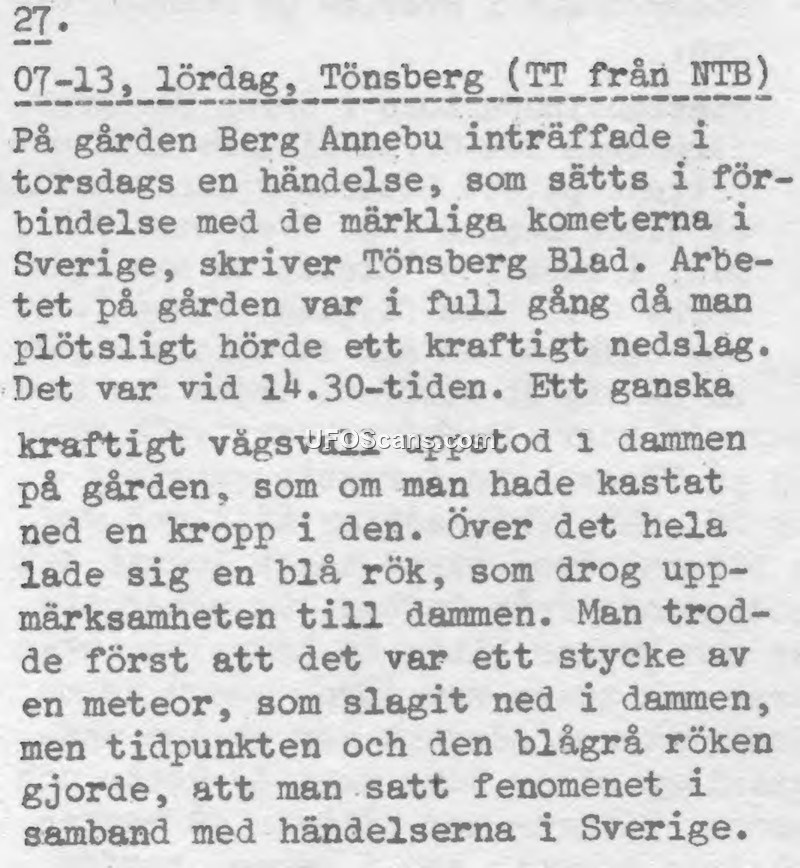 A press report describes a mysterious impact event at Berg Annebu farm in Norway, characterized by a loud noise, a water disturbance, and blue-gray smoke. Witnesses linked the event to reports of strange comets in Sweden.