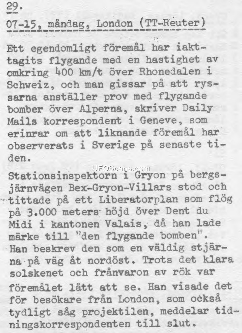 A press report from July 15, 1946, describes a sighting of an unidentified aerial object over the Swiss Alps. Witnesses, including a railway station inspector and visitors from London, observed a star-like object moving at 400 km/h.