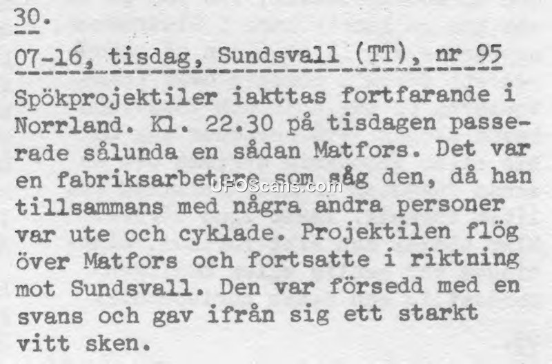 A press report from TT (nr 95) documents a sighting of a 'ghost projectile' in Matfors, Sweden, on a Tuesday at 22:30. The object was described as having a tail and emitting a strong white light while traveling toward Sundsvall.