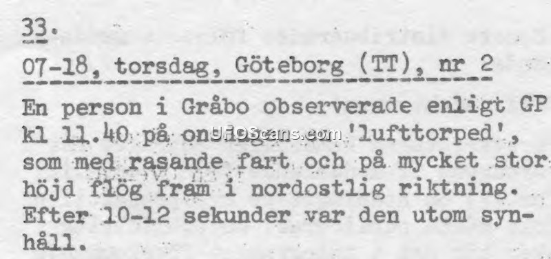 A brief press report from July 18 detailing a sighting of an 'air torpedo' over Gråbo, Sweden, on a Wednesday at 11:40. The object was observed at high altitude moving rapidly northeast for 10-12 seconds.
