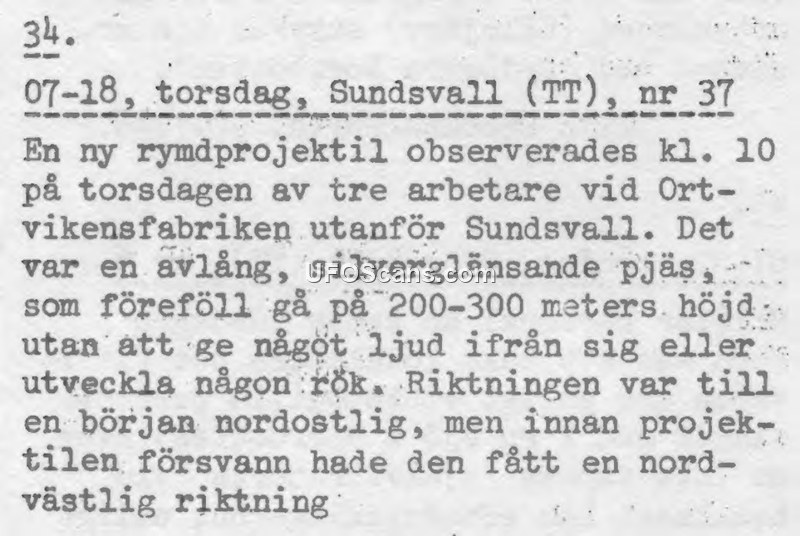 On a Thursday at 10:00, three workers at the Ortviken factory (Ortvikensfabriken) located outside of Sundsvall, Sweden, observed an unidentified object described as a new space projectile. The object was characterized as an oblong, silver-shining piece that maintained an altitude of approximately 200 to 300 meters. The witnesses reported that the object traveled silently and did not emit any smoke. Initially, the projectile was moving in a northeasterly direction, but it shifted to a northwesterly trajectory before it disappeared from view.