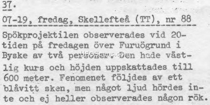 A report of a 'ghost projectile' observed by two people over Furuögrund, Sweden, at 20:00 on a Friday. The object displayed a blue-white light, traveled westward at 600 meters, and produced no sound or smoke.