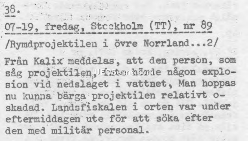 A press report from July 19th describes the search for a 'space projectile' that impacted water in Kalix, Sweden. Local authorities and military personnel were involved in the recovery effort.