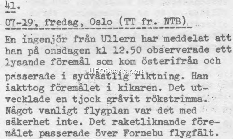 A report of a luminous, rocket-like object observed by an engineer over Fornebu airfield in Norway. The witness noted a thick smoke trail and stated it was not a conventional aircraft.