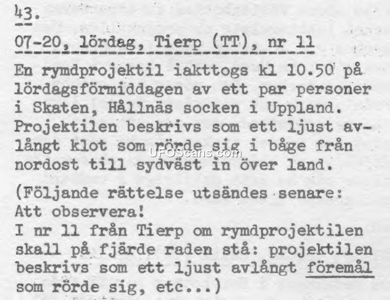 This document is a brief report from the news agency TT regarding a sighting that occurred on a Saturday at 10:50 AM in Skaten, Hållnäs parish, Uppland, Sweden. A couple of witnesses observed a 'space projectile' described as a bright, elongated object moving in an arc from the northeast to the southwest over land. The document includes a later correction issued by the agency, which clarified that the object should be described as an 'elongated object' rather than an 'elongated sphere'.