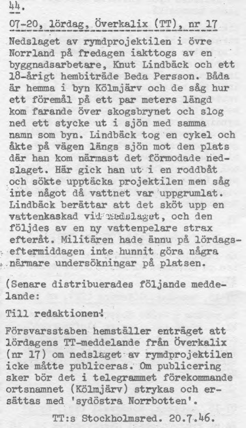 A press report details a 1946 sighting of a projectile crashing into a lake in Kölmjärv, Sweden. The Swedish Defense Staff subsequently issued a directive to suppress the specific location of the incident in media reports.