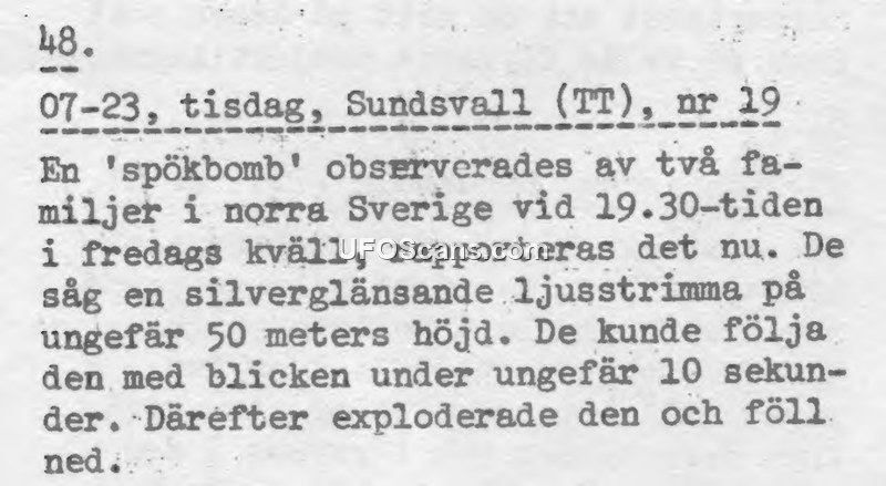 A press report from July 23 regarding a 'ghost bomb' sighting in Northern Sweden. Two families observed a silver, light-emitting object at 50 meters altitude for 10 seconds before it exploded.