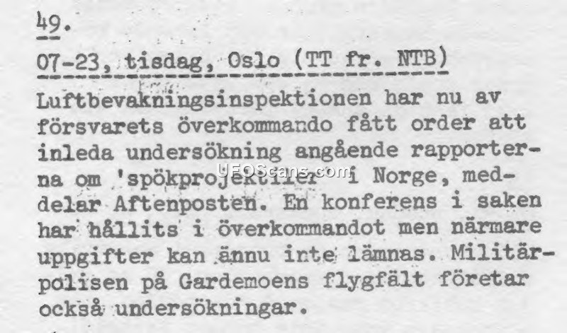 Luftbevakningsinspektionen har nu av försvarets överkommando fått order att inleda undersökning angående rapporterna om 'spökprojektiler' i Norge