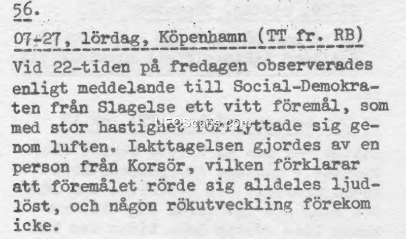 This document, numbered 56, is a brief press report dated Saturday, July 27, concerning a sighting in Copenhagen. According to a report received by the newspaper Social-Demokraten from Slagelse, a white object was observed moving through the air at high speed at approximately 22:00 on the preceding Friday. The observation was made by an individual from Korsör, who reported that the object moved completely silently and produced no smoke.