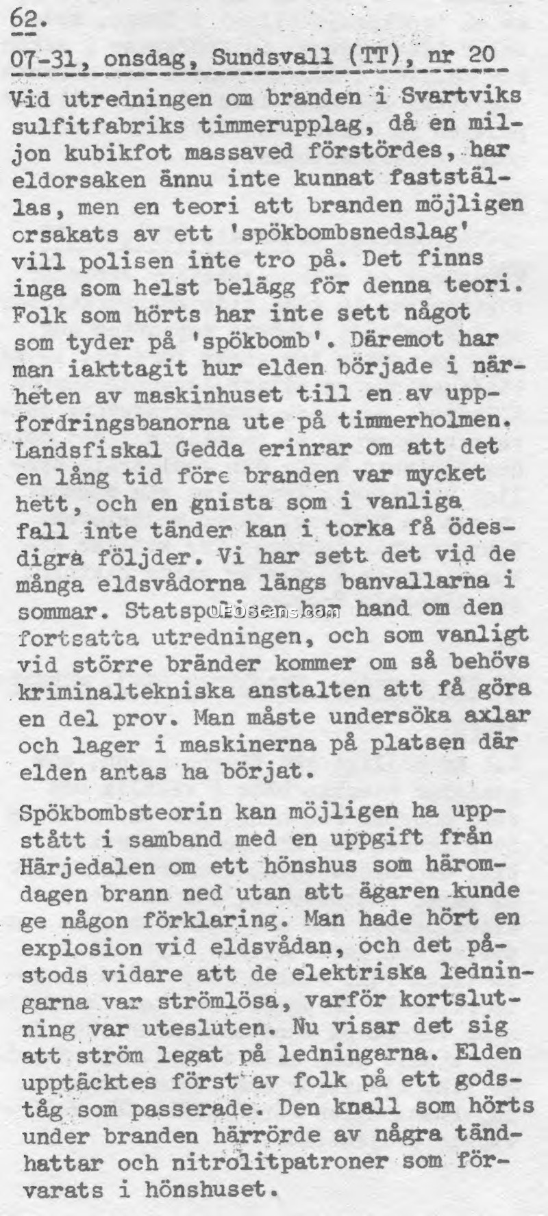 A press report from July 31st dismisses 'ghost bomb' theories regarding a timber yard fire in Svartvik, attributing the fire to dry weather and mechanical factors. It also clarifies that a similar incident in Härjedalen was caused by stored explosives rather than an anomalous aerial phenomenon.