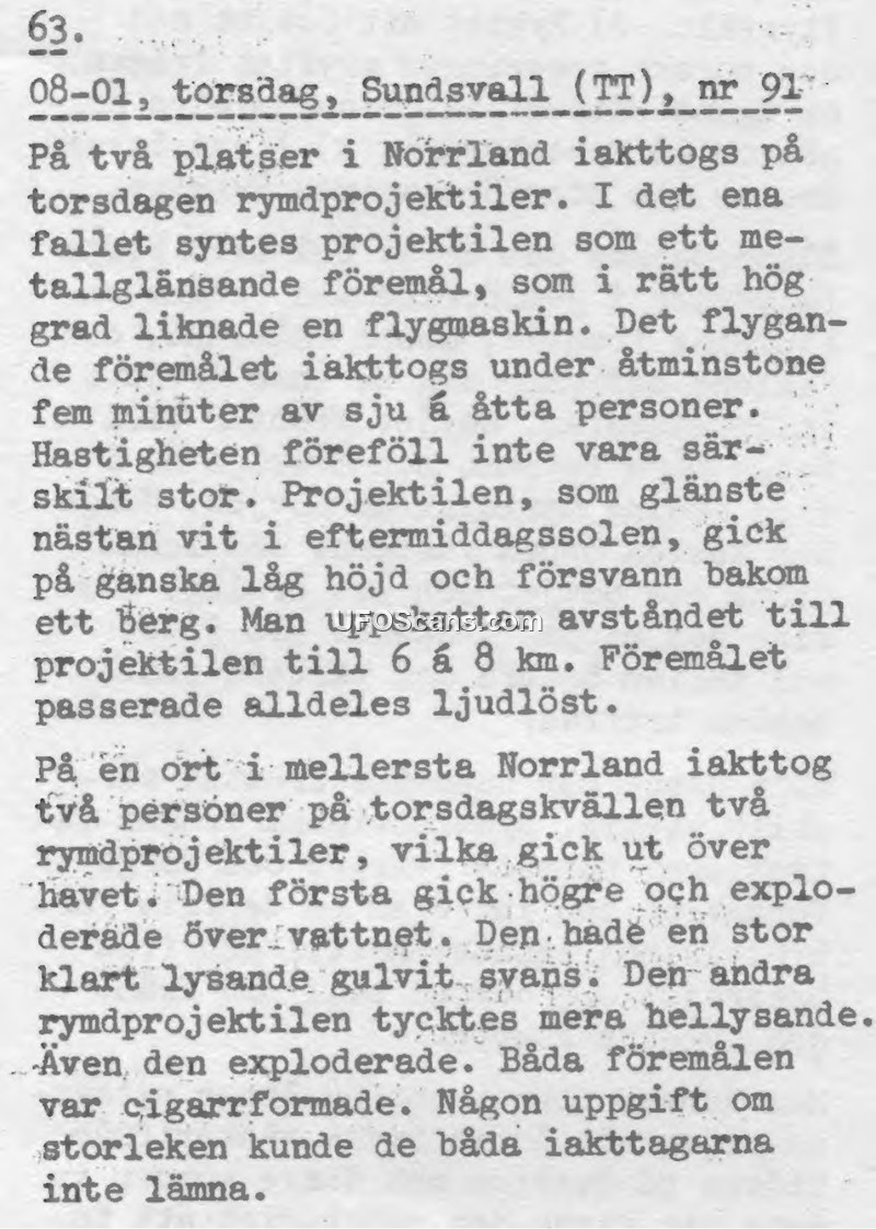 This document, identified as report number 91 from the news agency TT, details two separate sightings of 'space projectiles' (rymdprojektiler) in the Norrland region of Sweden on a Thursday, August 1st. In the first incident, seven to eight witnesses observed a metallic, cigar-shaped object for at least five minutes. The object, which appeared similar to an aircraft, shone white in the afternoon sun, traveled at a low altitude, and moved silently before disappearing behind a mountain. The witnesses estimated the distance to the object to be between 6 and 8 kilometers. In a second incident occurring in central Norrland on the same Thursday evening, two witnesses observed two additional space projectiles traveling out over the sea. The first of these flew at a higher altitude and exploded over the water, leaving a large, clearly luminous yellow-white tail. The second object, also described as cigar-shaped, appeared more luminous and subsequently exploded as well. The witnesses were unable to provide any information regarding the size of the objects.