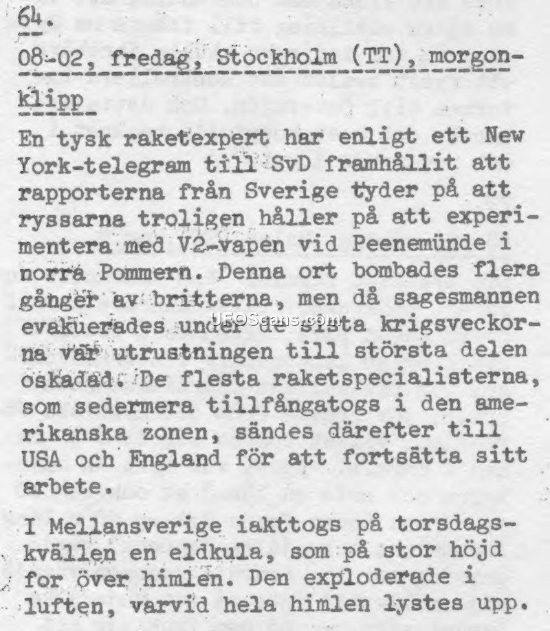 A German rocket expert suggests that reports from Sweden indicate Russians are experimenting with V-2 weapons at Peenemünde. Additionally, a fireball was observed over Central Sweden on Thursday evening.