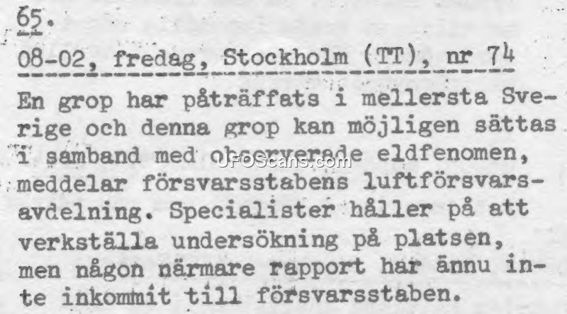 This document, identified as item number 65, is a brief press release dated August 2nd from the Air Defense Department of the Swedish Defense Staff. It reports the discovery of a pit in central Sweden. The authorities suggest that this physical trace may potentially be linked to fire phenomena that had been previously observed in the area. At the time of the report, specialists were in the process of conducting an on-site investigation; however, the Defense Staff had not yet received a detailed report regarding the findings.