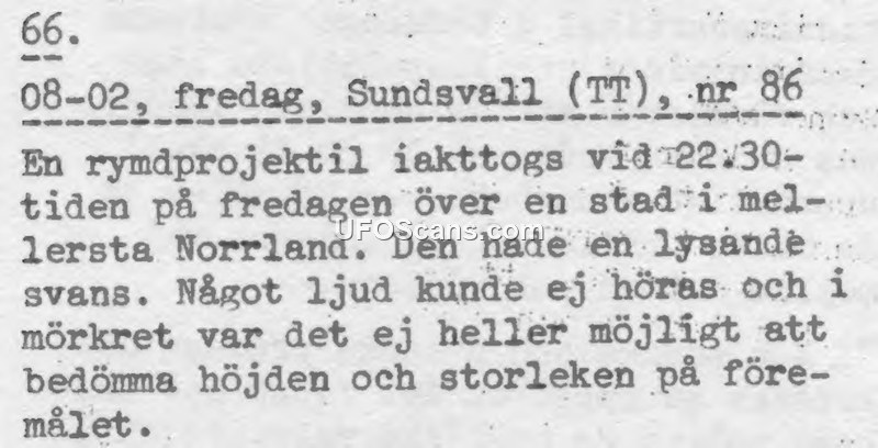 This document is a brief report, numbered 86, regarding a sighting that occurred on a Friday, August 2nd, in Sundsvall. At approximately 22:30, a 'space projectile' was observed over a city in central Norrland. The object was described as having a luminous tail. The report notes that no sound was heard during the event. Furthermore, due to the darkness, it was impossible for observers to estimate the altitude or the size of the object.