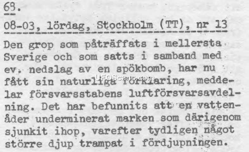 This document, identified as report number 13, provides an official statement from the Air Defense Department of the Swedish Defense Staff regarding a pit discovered in central Sweden. The site had previously been associated with the potential impact of a 'ghost bomb' (spökbomb). The Defense Staff has concluded that the phenomenon has a natural explanation. Investigations revealed that a water vein had undermined the ground, leading to a collapse. Subsequently, it appears that something of greater depth stepped into the resulting depression.