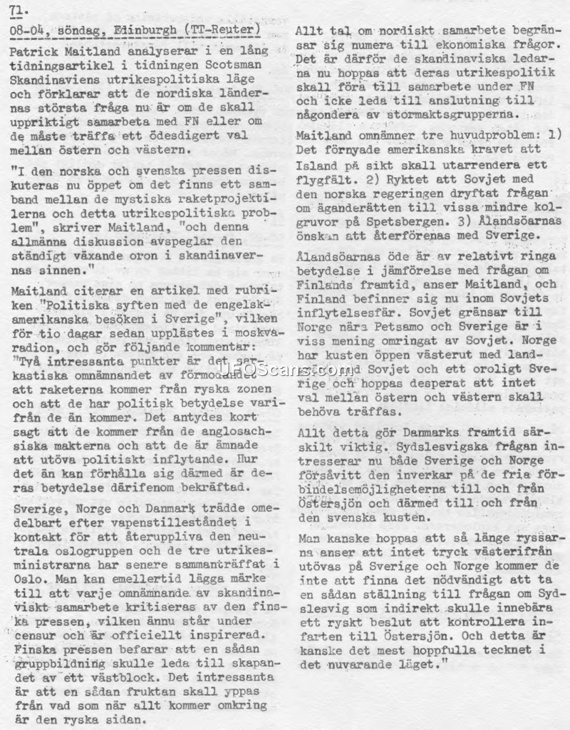 08-04, söndag, Edinburgh (TT-Reuter) - Patrick Maitland analysis of Scandinavian foreign policy