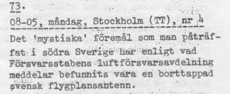 This brief press report, numbered 73 and dated Monday, August 5th, concerns the identification of an object previously described as 'mystical' that had been discovered in southern Sweden. According to the Defense Staff's Air Defense Department (Försvarsstabens luftförsvarsavdelning), the object was investigated and subsequently identified as a lost Swedish aircraft antenna.