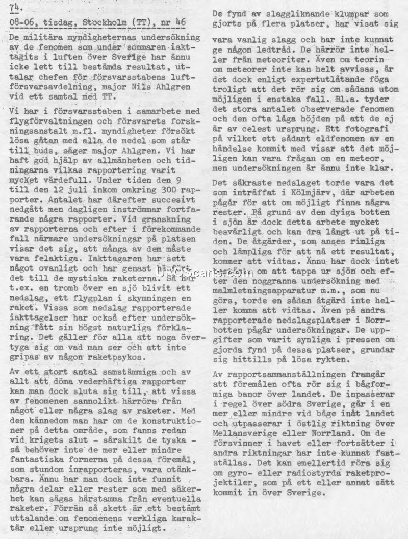 This document, dated August 6, 1946, reports on the Swedish military's investigation into aerial phenomena observed over Sweden during the summer of 1946. Major Nils Ahlgren, head of the Air Defense Department of the Defense Staff, states that despite collaboration with the Air Administration and the National Defense Research Institute, no definitive conclusions have been reached. Between July 9 and July 12, approximately 300 reports were received. Many of these were determined to be misidentifications of natural phenomena, such as waterspouts or aircraft, often attributed to 'rocket psychosis' by the public. However, the military acknowledges that some reports are credible and suggest the presence of rocket-like objects, possibly of German design from the end of the war. These objects are described as moving in arc-shaped paths over southern and central Sweden. Investigations are ongoing, specifically at a site in Kölmjärv where a potential impact occurred, though the muddy lake bottom makes recovery difficult. No physical evidence has been recovered to date, and the military cautions that until such evidence is found, the true nature or origin of the phenomena remains unknown.