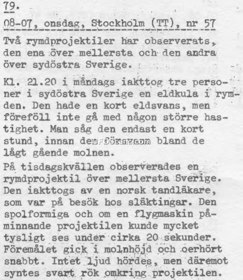 This press report from the Swedish news agency TT details two separate sightings of 'space projectiles' over Sweden. The first incident occurred on a Monday at 21:20, when three individuals in southeastern Sweden observed a fireball in the sky. This object featured a short tail of fire and did not appear to be moving at high speed before it vanished into low-hanging clouds. The second incident took place on Tuesday evening over central Sweden. This object was observed by a Norwegian dentist who was visiting relatives. The witness described the projectile as spindle-shaped and reminiscent of an airplane. It was visible for approximately 20 seconds, traveling at cloud height at an extremely high speed. While no sound was heard, the witness noted that black smoke was visible around the object.