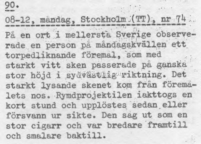 A press report from the Swedish news agency TT describes a sighting of a torpedo-shaped, cigar-like object in central Sweden. The object emitted a bright white light from its nose and disappeared after a short observation.