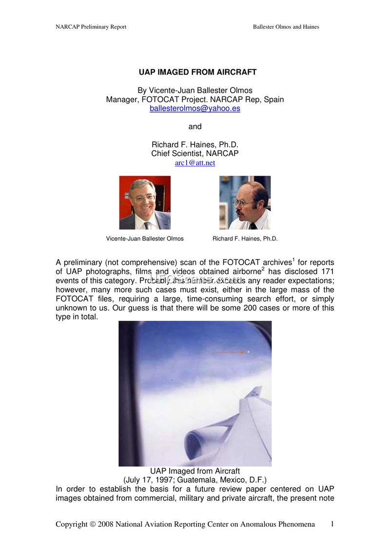 This preliminary report, authored by Vicente-Juan Ballester Olmos and Richard F. Haines, Ph.D., for the National Aviation Reporting Center on Anomalous Phenomena (NARCAP), provides an initial analysis of UAP imagery captured from commercial, military, and private aircraft. The report is based on data from the FOTOCAT project, which maintains a database of approximately 9,000 UFO photographic cases. The authors identified 171 specific incidents where UAP were captured on film, video, or still photography from airborne platforms. The report categorizes these incidents by decade, noting a distribution ranging from the 'foo-fighters' of World War II to cases in the 2000s. The authors highlight that 15% of these entries involve objects that were not visually observed by the photographer at the time of capture. Furthermore, they report that 45% of the cases have been attributed to conventional explanations, though they caution that this assessment is preliminary and subject to further investigation. The report identifies the United States as the primary source of these images, followed by Italy, Argentina, Japan, Mexico, Germany, Peru, Spain, China, Great Britain, and Norway. The authors explicitly state that the catalogue is 'under construction' and intended to stimulate further research and data sharing among the international scientific community. They request that researchers submit additional cases to help complete the dataset, which will eventually be used to assess potential air safety hazards. The document concludes with a series of notes detailing the methodology and specific contributors to the FOTOCAT project, including acknowledgments of work by specialists such as Marco Orlandi, Carlos Ferguson, and Ole Jonny Braenne.