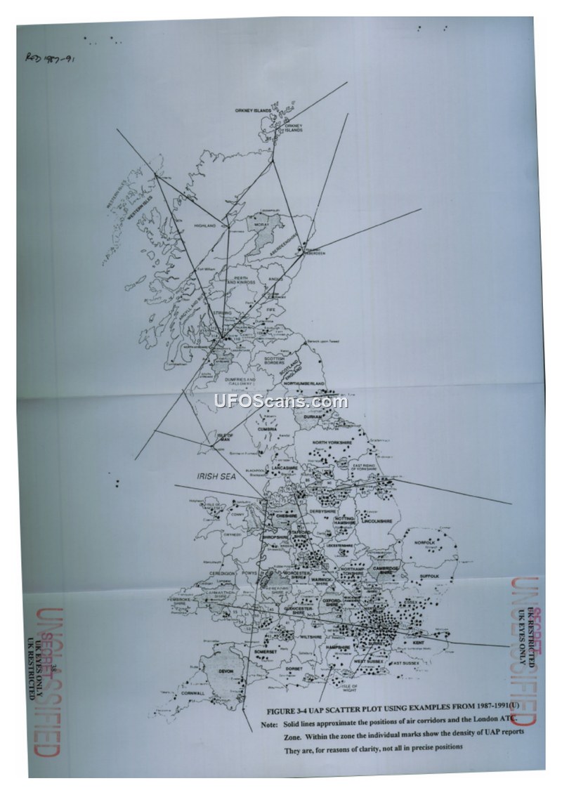 This document is a scatter plot map showing the density of UAP reports across the UK from 1987-1991. It overlays these reports with air corridors and the London ATC zone to visualize potential correlations.