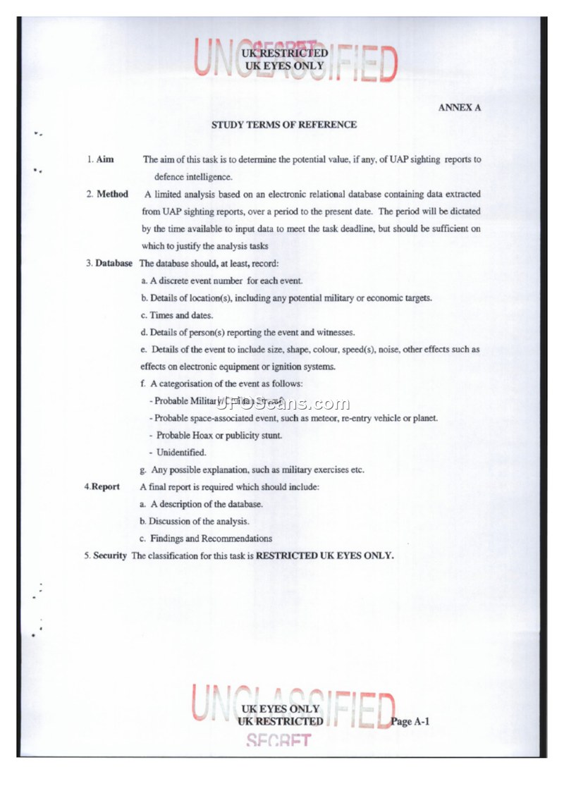 This document serves as a comprehensive overview of the United Kingdom's Ministry of Defence procedures for the collection, analysis, and database management of Unidentified Aerial Phenomena (UAP) sighting reports. The document is structured into several annexes. Annex A establishes the 'Study Terms of Reference,' which aims to determine the potential value of UAP reports to defence intelligence. It mandates the creation of an electronic relational database to record specific event details, including location, witness information, physical characteristics of the object, and categorization (e.g., probable military/civilian aircraft, space-associated events, or hoaxes). Annex B provides standardized reporting forms for UAP sightings, including examples of completed reports from 1993, 1996, and 1997. These reports detail observations ranging from light formations to objects described as 'kite shaped' or 'cigar-shaped.' Annex C presents a historical compilation of UAP-related reports from Czechoslovakia spanning from 1607 to 1985, intended to demonstrate the consistency of descriptions over time. Annex D details the 'UAP Access Database' architecture, explaining that the system uses 13 input tables to categorize data. The methodology emphasizes manual data entry from paper reports, the use of unique event numbers, and the importance of cross-referencing sightings with known military or economic targets to eliminate spurious reports. The document highlights that the database is designed to facilitate future analysis and that the classification of the task is 'RESTRICTED UK EYES ONLY.' It notes that while statistical analysis is performed, the lack of 'computer-friendly' formats in original reports remains a limitation. The document concludes by outlining the specific tables used for data entry, such as physical description, object motion, technical effects, and meteorological conditions, to ensure a rigorous approach to UAP investigation.