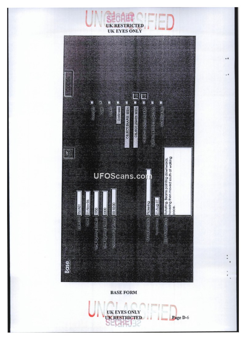 This document comprises a collection of database forms and a historical memorandum regarding the investigation of Unidentified Aerial Phenomena (UAP) in the United Kingdom. The first section provides a detailed template for a 'Base Form' used to log UAP sightings, including fields for event timing, location, witness descriptions, object physical characteristics, motion, technical effects, and meteorological conditions. A sample entry for an event on November 1, 1996, in Pickering is included, describing a rotating object with downward-pointing beams that hovered before moving south at a walking pace. The document also includes a 'Base Datasheet' listing various sightings from late 1996 to early 1997, detailing event IDs, dates, times, and locations such as Shotts, Mill Hill, and Lark Hill. The latter portion of the document contains 'Initial Analysis Requirements' (Annex E), which outline the methodology for processing these reports, including plotting events against geographical locations, time of day, proximity to airports and power stations, and identifying patterns in reported shapes or witness types. Finally, the document includes a historical memorandum (Annex F) from the Air Ministry to the Prime Minister, dated August 9, 1952. This memorandum summarizes the findings of a 1951 intelligence study on 'flying saucers,' concluding that all incidents could be explained by known astronomical or meteorological phenomena, misidentification of conventional aircraft or birds, optical illusions, or deliberate hoaxes. The memorandum notes that the American investigation of 1948/9 reached similar conclusions and that the Air Staff's opinion remained unchanged as of 1952.