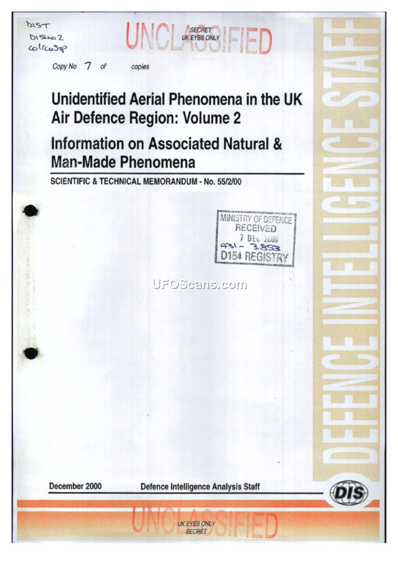 This is a 2000 UK Ministry of Defence scientific memorandum detailing natural and man-made phenomena that may explain UAP sightings. It provides technical analysis on the electromagnetic, physiological, and physical effects associated with UAP reports.