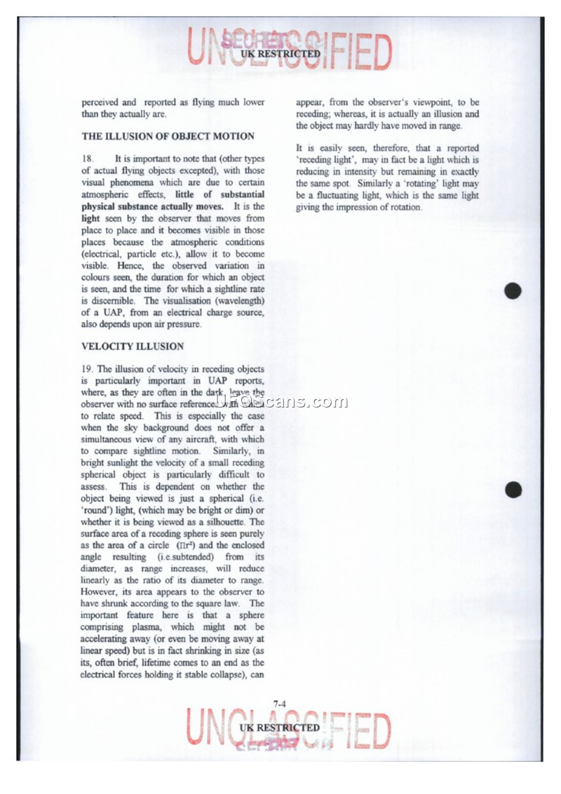 This document consists of a series of scientific and technical memoranda from the Defence Intelligence Staff (DIS) regarding the analysis and filtering of Unidentified Aerial Phenomena (UAP) reports. The text provides a detailed breakdown of common visual and auditory illusions that lead to UAP sightings. It explains that observers often misinterpret the velocity and motion of objects due to the lack of reference points in the sky, particularly when viewing small, receding, or rotating lights. The document also addresses the 'rarity of UAP sound' reports, noting that while observers often expect a 'vehicle' to produce noise, many UAP sightings involve objects that are either too distant, are satellites, or are composed of charged air masses (such as aerosols or plasmas) that do not generate traditional mechanical or aerodynamic sound. The memorandum further outlines the 'UK Low Flying System' and provides strict criteria for filtering out reports that are actually conventional military or civil aircraft. It explicitly mentions that certain UAP reports can be attributed to covert aircraft programmes, such as the SR-71 (Senior Crown), and discusses the potential for misidentifying experimental aircraft or foreign developments, such as the Russian 'thermoplane' developed by the Moscow Aviation Institute. The document serves as a technical guide for intelligence analysts to systematically eliminate conventional explanations—including weather, satellites, and known aircraft flight paths—before classifying an event as a genuine anomaly. It emphasizes that many reports are the result of human error, imagination, or the misinterpretation of natural atmospheric phenomena.