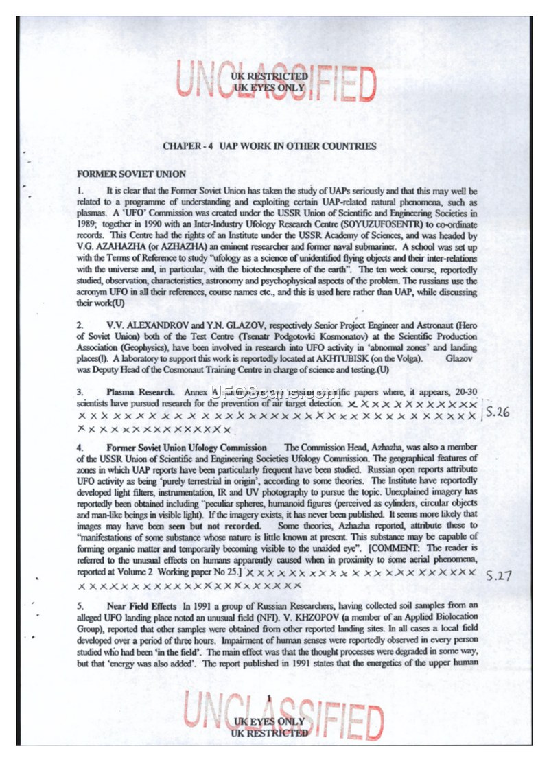 This intelligence assessment, titled 'Chapter 4: UAP Work in Other Countries', provides an overview of international research into Unidentified Aerial Phenomena (UAP), with a primary focus on the Soviet Union. The document details the establishment of various Soviet research bodies, such as the 'UFO Commission' under the USSR Union of Scientific and Engineering Societies and the 'All Union Ufology Association'. It highlights the involvement of prominent figures, including scientists, engineers, and cosmonauts, in investigating UAP activity, particularly in 'abnormal zones' and areas of nuclear testing or disaster. The assessment describes specific Russian research into plasma formations, suggesting that these phenomena—often appearing as spherical, light-emitting objects—may account for many UAP reports. The document outlines theoretical work by researchers like Avramenko, who studied plasma properties, including their ability to pass through obstacles and maintain stability. It also notes reports of physiological effects on humans, such as impaired senses and degraded thought processes, following proximity to alleged landing sites. Furthermore, the document briefly mentions UAP-related activities in other nations, noting China's 1993 establishment of a 'Scientific Institute for the Study of UFOs', Spain's collection of UAP files, and research in the USA and Canada, including medical experiments that replicated UAP-related effects on humans. The document concludes with an Annex detailing the generation of plasma formations, proposing that many UAP sightings can be explained by natural or man-made plasma phenomena, while acknowledging that this theory does not fully account for all reported characteristics.