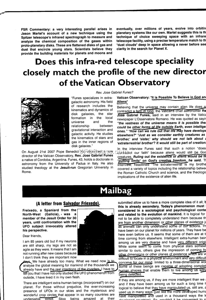 This document is a compilation of articles, letters, and reports concerning Unidentified Aerial Phenomena (UAP) and extraterrestrial life. It begins with a commentary on new infrared telescope technology and its potential to aid in the search for extraterrestrial life, followed by a profile of Rev. Jose Gabriel Funes, the director of the Vatican Observatory, who discusses the theological compatibility of extraterrestrial life with Catholic doctrine. The document includes a 'Mailbag' section featuring a letter from Salvador Frixeedo, who discusses the sociological and psychological implications of UFOs and the possibility of intelligent extra-human beings living among us. Further sections detail the 'Twelfth UFO Forum' held in Wroclaw, Poland, in May 2008, highlighting the activities of various Polish UFO research groups and the challenges of public disclosure. The document also presents specific sighting reports, including a 2002 account from Filey, UK, where a witness observed an object resembling a dolphin, and a 2008 report from Hampshire, UK, involving a photograph of an unidentified object. Throughout the text, there is ongoing discussion regarding the nature of UFOs, with contributors debating whether they are physical craft, trans-dimensional entities, or phenomena influenced by electromagnetic effects on the human brain.