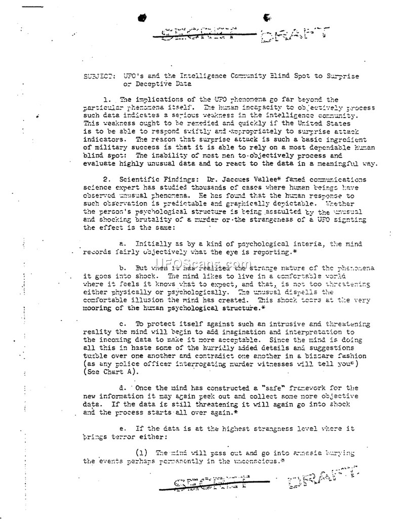 This intelligence assessment, marked as a draft, examines the 'blind spot' within the intelligence community regarding UFO phenomena. The central thesis is that human psychological limitations prevent the objective processing of highly unusual data. According to the document, when an individual encounters a UFO, the mind initially attempts to report what the eye sees, but the 'strange nature' of the phenomenon induces shock. To cope with this, the mind constructs a 'safe' framework, often incorporating imagination and interpretation, which results in inconsistent and bizarre accounts. The document notes that at the highest levels of strangeness, the mind may experience amnesia or a complete psychological collapse, which the individual may interpret as a religious experience. The author cites Dr. Jacques Vallee as an expert who has studied these patterns. The document includes an appendix detailing historical military failures—such as the French reliance on the Maginot Line in 1940, the German failure to anticipate the Normandy invasion, and the U.S. failure to anticipate the attack on Pearl Harbor—to illustrate how a refusal to accept 'radical' or 'inconceivable' threats leads to defeat. The document concludes that the intelligence community must overcome these human biases to effectively respond to unusual or deceptive data.
