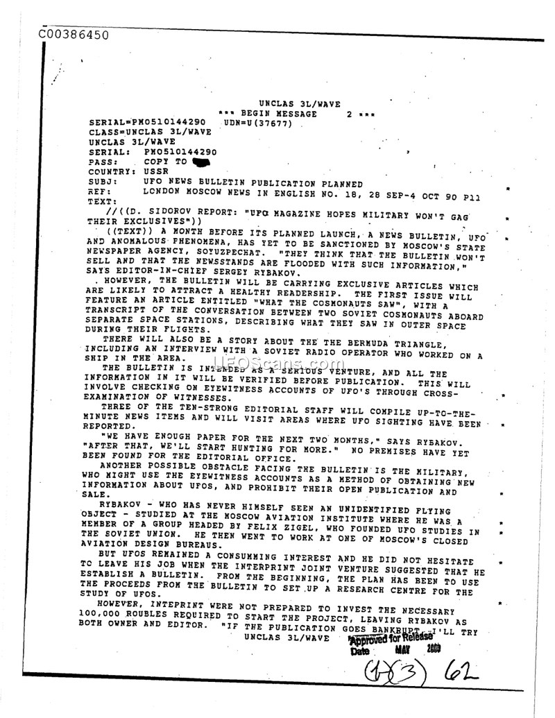 This document reports on the planned launch of a Soviet UFO news bulletin by editor Sergey Rybakov. It details the publication's goals, financial challenges, and potential military opposition.