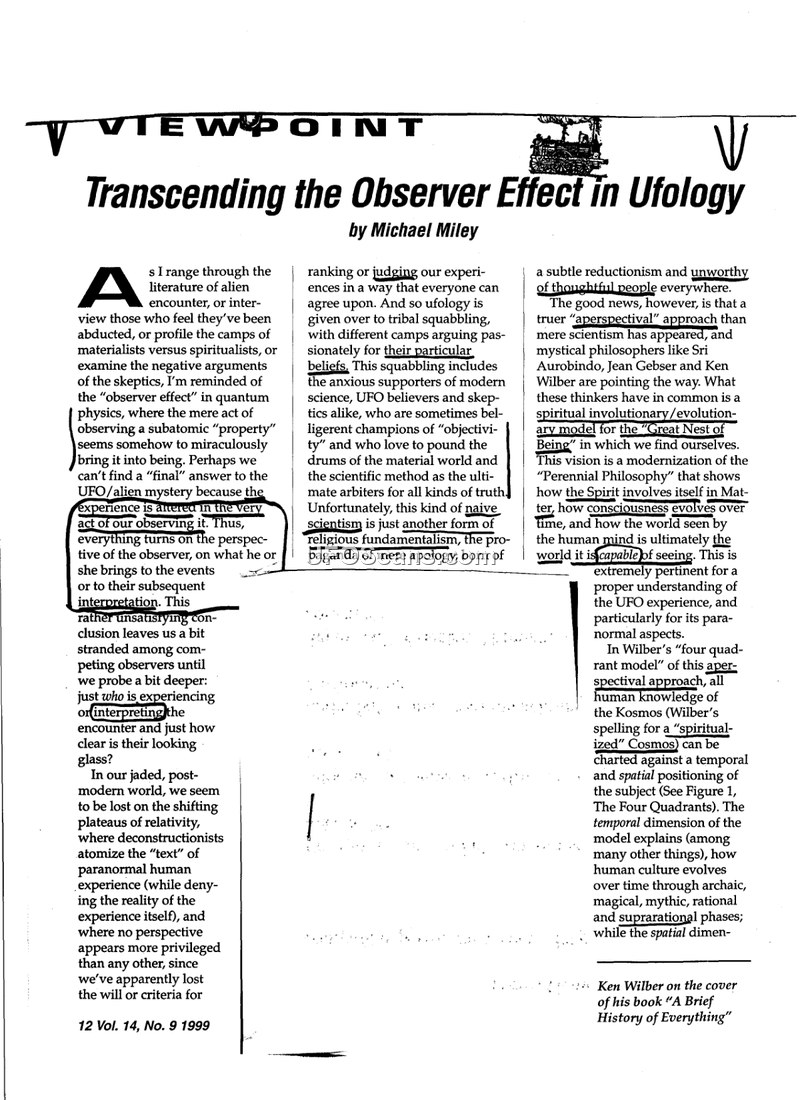 This article, written by Michael Miley and published in UFO Magazine (Vol. 14, No. 9, 1999), explores the philosophical and cognitive dimensions of the UFO/alien encounter phenomenon. Miley argues that the field of ufology is currently hindered by a divide between materialists and spiritualists, both of whom often rely on narrow, dogmatic interpretations. Drawing heavily on the work of Ken Wilber, particularly his four-quadrant model of human knowledge and Kosmic evolution, Miley posits that the 'observer effect'—a concept borrowed from quantum physics—is central to understanding these encounters. He suggests that the observer's perspective, shaped by their own cognitive limitations and cultural conditioning, fundamentally influences the nature of the experience. Miley contends that current scientific methods, which treat the UFO phenomenon as an external object to be studied, are insufficient because they fail to account for the role of consciousness. He argues that the UFO/alien encounter may be an experience that accentuates aspects of human consciousness, and that true understanding requires a shift toward a more 'perspectival' approach. The author suggests that humanity is currently operating at a limited cognitive level, which he compares to looking through a keyhole, seeing only fragments of a larger reality. He concludes that the phenomenon can only be fully comprehended by 'fully-awakened' human beings who have transcended their own subjective limitations. The article includes a diagram of Wilber's four-quadrant model, which maps human experience across interior/exterior and individual/collective dimensions. Miley also references the insights of figures such as Sri Aurobindo, Jean Gebser, and Ramana Maharshi to support his argument that consciousness is evolving and that the UFO phenomenon may be a catalyst for this evolution. The piece concludes with a call for a broader, more integrated approach to ufology that moves beyond the limitations of traditional scientific inquiry.