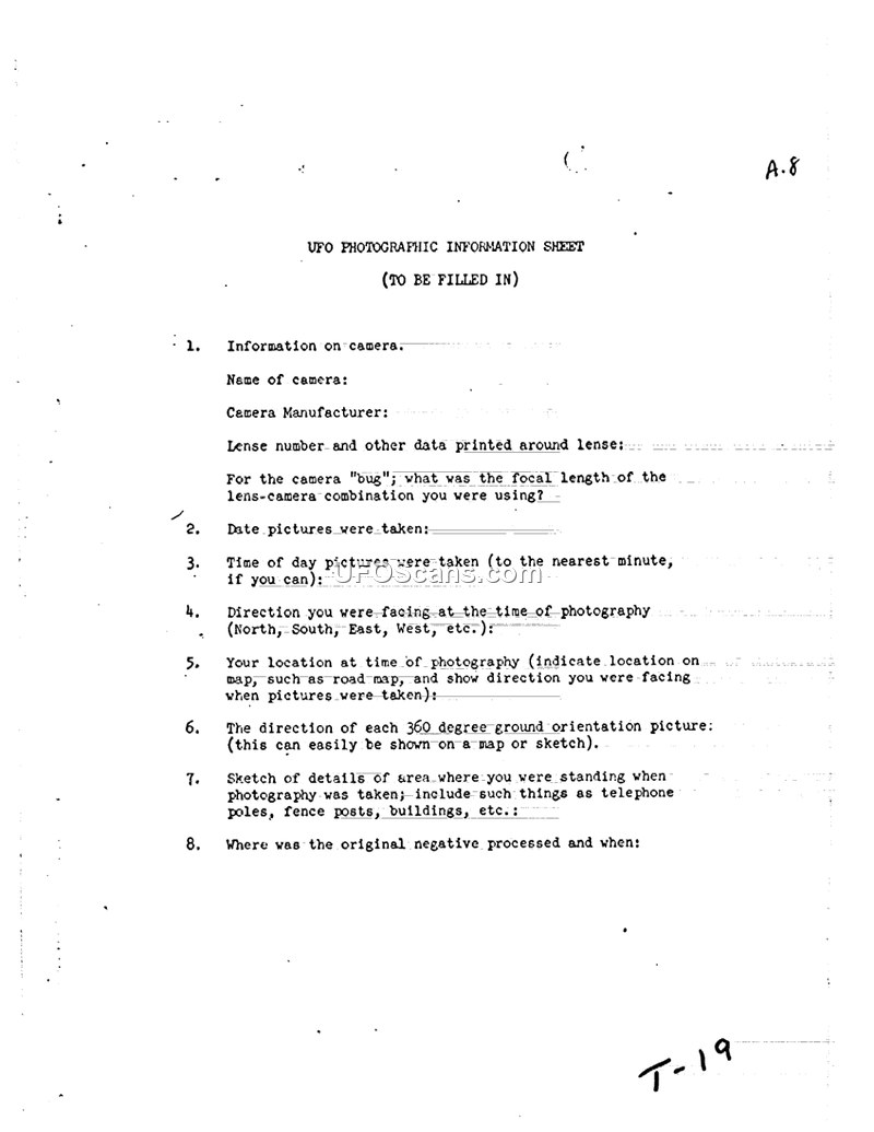 This document is a standardized form titled 'UFO Photographic Information Sheet' designed to be completed by individuals who have captured photographic evidence of Unidentified Aerial Phenomena. The form requests specific technical and contextual details to assist in the analysis of such imagery. It asks for camera specifications, including the manufacturer, lens number, and the focal length of the lens-camera combination used for the 'bug'. Furthermore, the form requires the date and time of the photography, the direction the photographer was facing, and their specific location, including a request for a map or sketch indicating the photographer's position relative to landmarks such as telephone poles, fence posts, and buildings. Finally, the form asks for information regarding the processing of the original negative, including where and when it was processed. The document is marked with the reference number A.8 and a handwritten notation 'T-19' at the bottom.