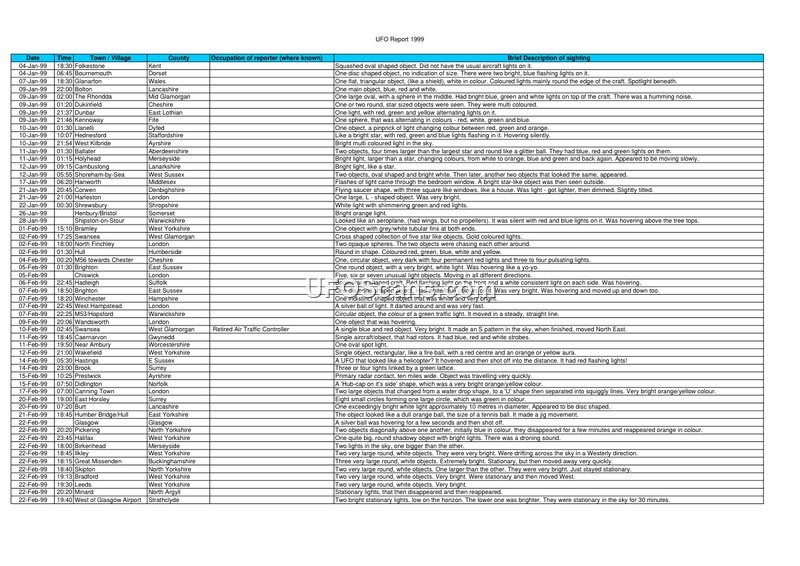 This document is a chronological log of UAP sightings reported across the United Kingdom in 1999. It provides a detailed record of hundreds of incidents, including descriptions of object shapes, behaviors, and witness observations.