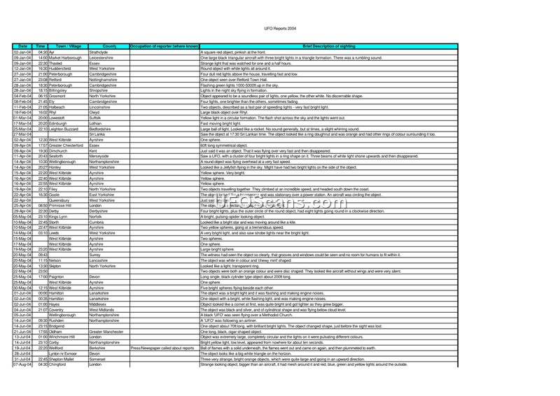 This document is a chronological log of unidentified aerial phenomena (UAP) sightings reported throughout the year 2004, primarily within the United Kingdom. The log entries detail the date, time, location (town/village and county), and a brief description of the reported sighting. The reports describe a wide variety of objects, including triangular aircraft, spheres, discs, cylinders, and balls of fire. Many reports note specific characteristics such as color, light patterns, speed, and sound. For instance, some reports describe objects as 'soundless' or 'silent,' while others mention engine noises or rumbling sounds. Several entries note the behavior of the objects, such as hovering, climbing at incredible speeds, or changing shape. The document also includes reports from international locations, such as Sri Lanka, and mentions specific events like a sighting over a Methodist Church and an object identified as an ATR 42 twin-propeller aeroplane. The descriptions vary in detail, ranging from simple 'yellow spheres' to complex accounts of objects with mesh, multiple colored lights, and specific structural features like windows and grooves. The log serves as a historical record of public reports of anomalous aerial activity during this period.