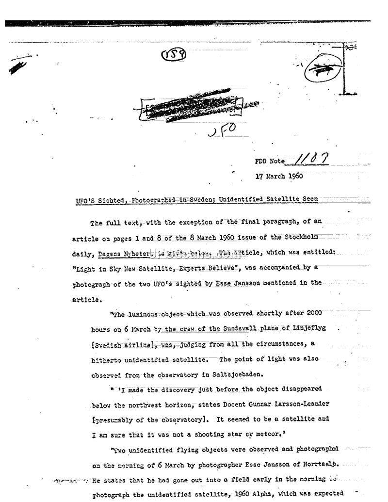 This FDD Note, dated 17 March 1960, compiles reports from the Swedish newspaper Dagens Nyheter regarding sightings of unidentified luminous objects in the sky over Sweden. The document details several distinct observations occurring around 6 March 1960. In one instance, the crew of a Linjeflyg plane observed a luminous object shortly after 2000 hours, which was also noted by the observatory in Saltsjoebaden. Docent Gunnar Larsson-Leander suggested the object was a satellite rather than a meteor. Separately, photographer Esse Jansson reported observing and photographing two unidentified flying objects on the morning of 6 March while attempting to photograph the satellite 1960 Alpha. Jansson noted that the objects initially moved in a slow, satellite-like manner before changing direction and returning the way they came; he also captured a third luminous object on one of his plates. Another resident, Thorsten Haakansson, reported observing the 'phantom satellite' 1960 Alpha with binoculars, noting it moved horizontally before descending at a right angle and disappearing. The document concludes by referencing additional reports of moving points of light observed over Stockholm on two successive evenings at 2230 hours.