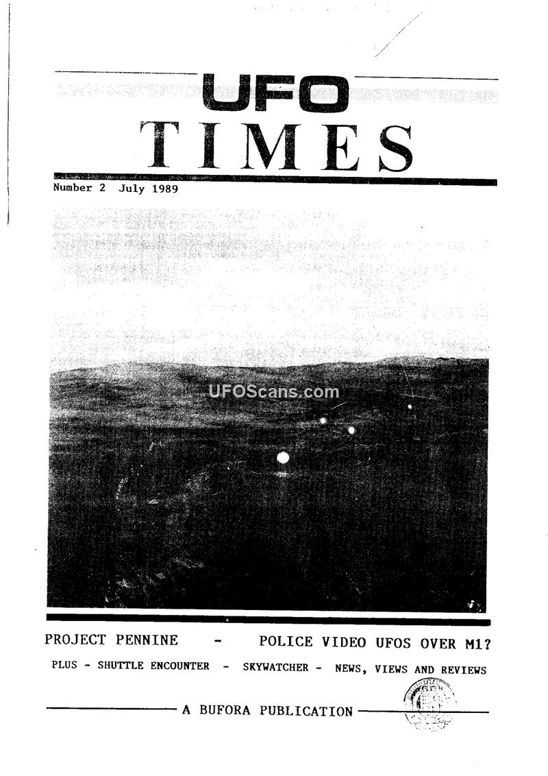 This document is the July 1989 issue (Number 2) of 'UFO Times', a publication of the British UFO Research Association (BUFORA). The issue serves as a compilation of news, research reports, and editorial commentary regarding UFO and UAP phenomena in the United Kingdom and Europe. A central feature is Dave Clarke's 'Project Pennine', a study of anomalous light phenomena in the moorlands of Northern England, which emphasizes the historical and folklore-related aspects of these sightings, often distinguishing them from 'structured craft'. Ken Phillips provides a preliminary report on a March 1988 sighting over the M1 motorway, which involved police reports and video footage from a traffic-monitoring camera. The issue also covers the 'Discovery' shuttle encounter, with Jenny Randles analyzing the media coverage and the lack of substantial evidence for the reported alien encounter. The magazine includes an obituary for Walter Raymond Drake, a notable figure in early ufology, and reviews of books such as Isaac Asimov's 'The Relativity of Wrong' and Dr. Terence Meaden's 'The Circles Effect and Its Mysteries'. Additionally, the publication details the organizational structure of BUFORA, including the National Investigation Committee (NIC), and provides a lecture programme for 1989/90. The editorial stance encourages collective, unbiased scientific research and highlights the need for European cooperation in ufology. The document also features a 'Skywatcher' section providing astronomical data for July and August 1989, and a 'Space News' section detailing European Space Agency (ESA) achievements.